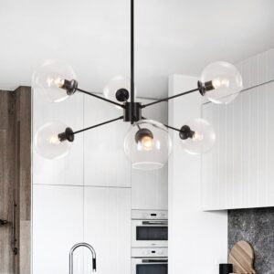 Serve up some chic mid-century modern vibes in your kitchen, dining room, or living room with this glass globe sputnik chandelier. Made from metal in a matte black finish, this blown glass chandelier features a spherical body with slender arms sticking out in different directions. Clear glass globe shades of the black sputnik chandelier sit at the end of each arm, providing a peek at compatible E26/E27 bulb bases ensconced within as they offer a boost of brightness. Hanging from an adjustable pole and a sloped ceiling-compatible canopy, you can install this blown glass chandelier almost anywhere you want.